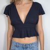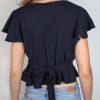 Blouse with bow back, front v neckline, short sleeves, short length, relaxed fit.
