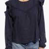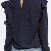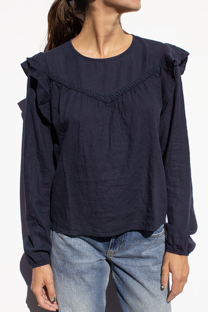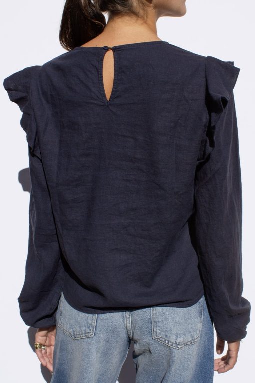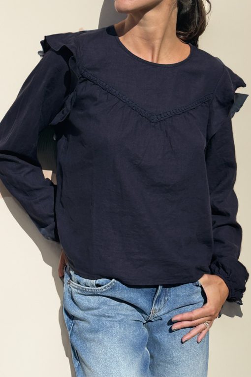 Blouse with ruffles on the shoulders, crew neckline, back button fastening, long sleeves, elastic cuffs, regular length, relaxed fit.