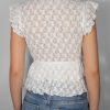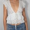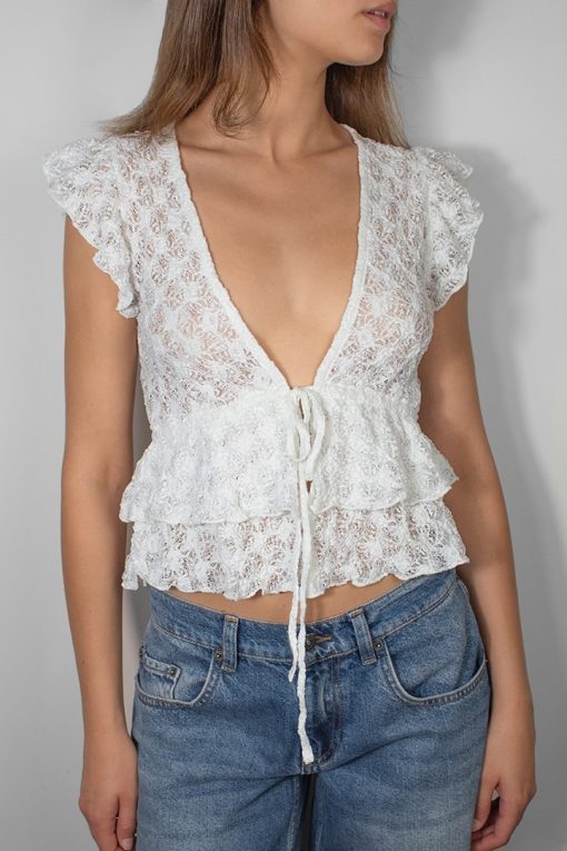 V-neck top, short sleeves, front tie fastening, lace fabric, with ruffle, regular length, tight fit.