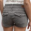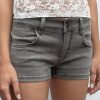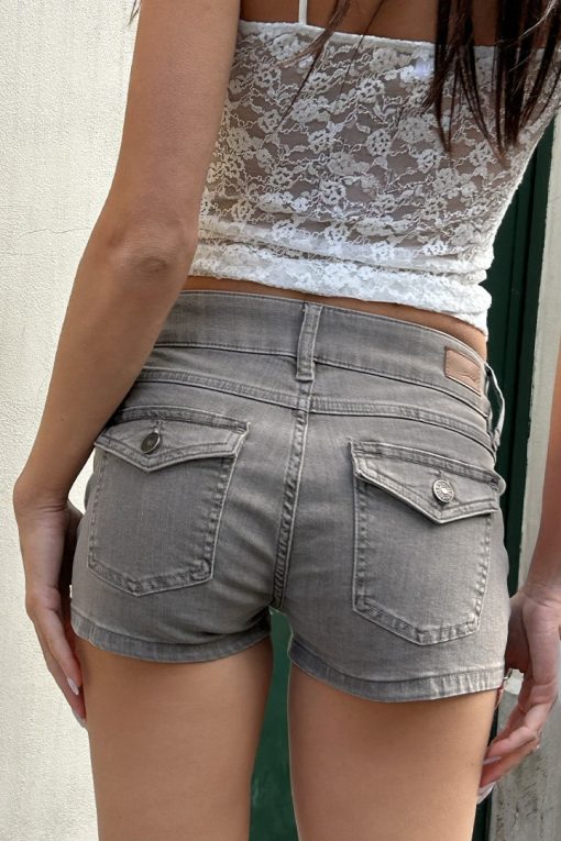 Denim shorts, super low waist, belt loops, back pockets with button, double button up and zip fastening, regular length, slim fit.